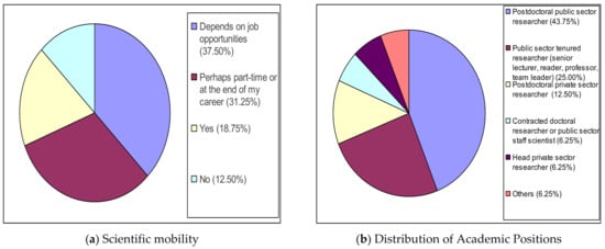 Figure 1a shows that 12.50% (2/16) of SRS in Health Sciences will not go abroad again to carry out scientific work. On the other hand, the percentages of scientists from this group who are sure they will go abroad again (18.75%, 3/16) or who will leave the country depending on job opportunities (37.50%, 6/16) are much higher. According to Figure 1b, the percentage of SRS in Health Sciences who work in permanent jobs in the scientific career is lower than that of those who work in temporary jobs. As shown in Figure 1b, the total figure for permanent jobs reaches a percentage of 37.50% (6/16), once the figures for contracted doctoral researchers or public sector staff scientists (6.25%, 1/16), tenured researchers (25.00%, 4/16) and head private-sector researchers (6.25%, 1/16) are added.