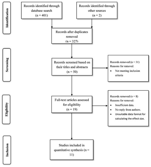 EndNote program [63] was used for importing studies from different databases. The first databases search produced 401 articles. Duplicates and articles that did not meet the inclusion criteria were removed firstly according to titles and abstracts and then according to full text reviews. All reference lists in the included articles and meta-analyses were also reviewed. The final number of articles that investigated the three main factors (bullying, one cognitive–motivational factor and academic achievement) and were included in the meta-analysis was 11 (Figure 1).
