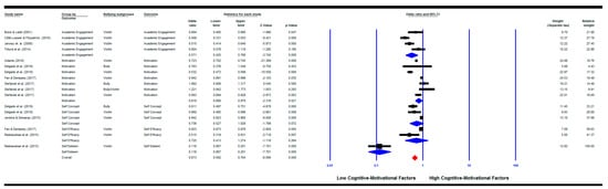 The combined effect size showed that children who are involved in any bullying behaviour were significantly less likely to be academically engaged (k = 4) (OR = 0.571, 95% CI (0.43, 0.77), p = 0.000), to have less motivation (k = 7) (OR = 0.82, 95% CI (0.69, 0.97), p = 0.021), and to have lower self-esteem (k = 1) (OR = 0.12, 95% CI (0.07, 0.20), p = 0.000). However, neither self-concept (k = 3) (OR = 0.74, 95% CI (0.53, 1.03), p = 0.072) nor self-efficacy (k = 2) (OR = 0.73, 95% CI (0.41, 1.27), p = 0.264) were significantly associated with bullying involvement. The heterogeneity assessments were significant for all except self-esteem (academic engagement: Q(3) = 14.39, p = 0.002; I2 = 79.16%; motivation: and Q(6) = 119.05, p = 0.000; I2 = 94.96%; self-concept: Q(2) = 21.78, p = 0.000; I2 = 90.82%; self-efficacy: Q(1) = 5.64, p = 0.018; I2 = 82.27%). The pooled effect size for the overall cognitive–motivational factors was significant (k = 17; OR = 0.67, 95% CI (0.59, 0.76), p = 0.000) with a significant heterogeneity between groups (Q(16) = 442.71, p = 0.000; I2 = 96.39%) (See Figure 2).