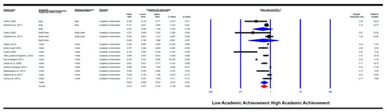 On the other hand, when looking specifically at assessment methods for the outcome (academic achievement), it was found that schools’ reports (k = 6, OR = 0.51, p = 0.005) and teachers’ reports (k = 1, OR = 0.69, p = 0.001) were significant, but not children’s reports (k = 7, OR = 0.67, p = 0.059).