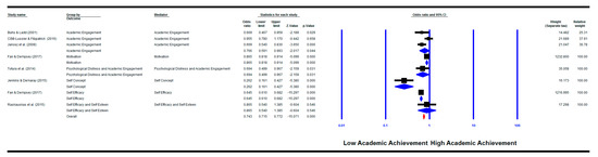 There were significant mediation effects between victimisation and academic achievement for psychological distress and academic engagement combined as one mediation factor (k = 1) (OR = 0.69, 95% CI (0.50, 0.97), p = 0.031), self-concept (k = 1) (OR = 0.26, 95% CI (0.16, 0.43), p = 0.000), self-efficacy (k = 1) (OR = 0.65, 95% CI (0.61, 0.68), p = 0.000), motivation (k = 1) (OR = 0.87, 95% CI (0.82, 0.91), p = 0.000) and academic engagement (k = 3) (OR = 0.77, 95% CI (0.59, 0.99), p = 0.044). On the other hand, no significant mediation was found for self-esteem and self-efficacy combined as one mediation factor (k = 1) (OR = 0.87, 95% CI (0.54, 1.39), p = 0.546).