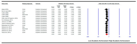 ‘One study removed’ analysis: meta-analysis showing the pooled effect size of the relationship between bullying involvement and academic achievement with each study removed.