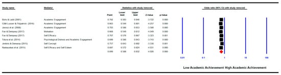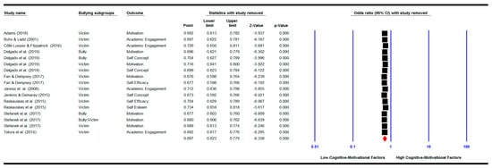 We repeated the meta-analyses by removing each study one by one. The results show that when removed none of the studies changed the pooled effect sizes for the relationship between bullying and/or victimisation involvement and academic achievement (See Figure 5), for the relationship between bullying and/or victimisation involvement and cognitive motivational factors (See Figure 6), and for the mediation analysis (See Figure 7). The pooled effect sizes remained significant as shown in the original analysis before removing any of the studies, indicating that none of the studies could change the results when removed.