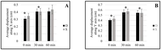 The two-way repeated-measures ANOVA revealed a significant time main effect in the stable condition (Table 1 and Table 2). A significant time main effect for average displacement along the anteroposterior direction (F (2, 34) = 4.545; p = 0.018; ηp2 = 0.211) was observed. Further analysis with post-hoc comparisons (Bonferroni) revealed significantly greater displacement along the anteroposterior direction at 30 min compared to 0 min (p = 0.017) (Figure 1A). Similarly, there was a significant time main effect for average displacement along the medial lateral direction (F (2, 34) = 11.439; p < 0.001; ηp2 = 0.402) in the stable condition. Further analysis with Bonferroni post-hoc comparisons revealed significantly greater displacement along the medial lateral direction at 30 min (p = 0.001) and at 60 min compared to 0 min (p = 0.004) (Figure 1B). In addition, a significant time main effect for 95% ellipsoid area was observed (F (2, 34) = 5.415; p = 0.009; ηp2 = 0.242) in the stable condition. Further analysis with post-hoc comparisons revealed significantly greater 95% ellipsoid area at 30 min (p = 0.011) and at 60 min compared to 0 min (p = 0.030) (Figure 1C).