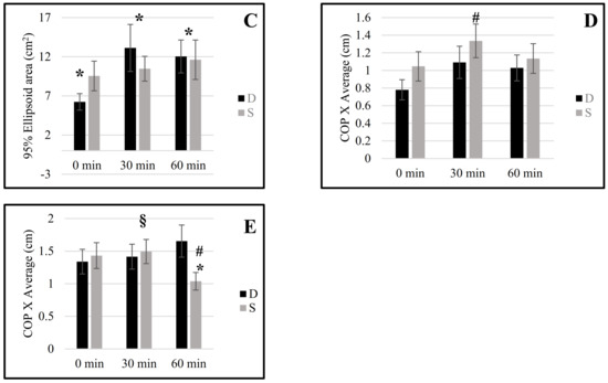 (A) Average displacement along the anteroposterior axis (X-axis) in the stable condition. * represent significant time differences. (B) Average displacement along Y-axis in the stable condition. * represent significant time differences. (C) 95% ellipsoid area in the stable condition. * represent significant time differences. (D) COP in the anteroposterior axis (COP-X average) in the unstable condition. # represents significant surface differences. (E) COP in the anteroposterior axis (COP-X average) in the stable condition. § represent significant time × surface interaction. # represents a significant difference between surfaces. * represents a significant difference from 0min and 30min. Bars represent the standard error. D: dry surface; S: slippery surface.