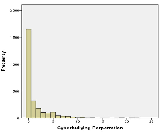 Data analysis was conducted using the SPSS version 22.0 software (IBM Corp., Armonk, NY, USA) and Stata 15.1 program (Stata Corp., College Station, TX, USA). First, descriptive statistics were employed. The outcome variable was set as the frequency of cyberbullying perpetration and contained nonnegative integer values. With respect to this variable, a total of 1649 (63.7%) adolescents answered “0” (Figure 1). Here, we used the ZINB regression model to examine which factors predicted the frequency of cyberbullying perpetration, particularly as it presents overdispersions and can adequately handle issues related to the presence of many zero values. Within the ZINB model, the large quantity of zero answers was assumed to be associated with a mixture of two discrete groups: the first was “true/structural zero,” or individuals who always report zero experiences of cyberbullying perpetration, while the second was “sampling zero,” or individuals who sometimes experience the issue, but had not done so within one year of the study period. As shown in previous research, the ZINB model can improve overall explanatory power by accounting for zero values [23,24]. The model estimation was undertaken with two latent groups: (1) the “0” group, with zero answers handled using a mixed strategy for the logit model, and (2) the group of respondents who reported at least a “1,” with answers analyzed using the count model [23,24]. In this context, the ZINB model was used to examine the logarithms of the logit model (which predicted the likelihood of future behavioral problems related to cyberbullying perpetration) and count model (which predicted the factors that influenced the severity of existing problems related to cyberbullying perpetration).