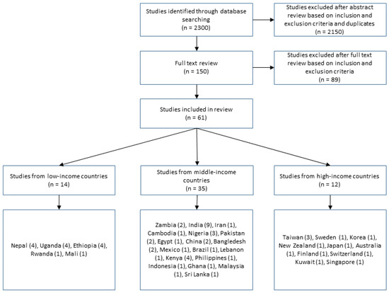 For the purposes of this review, the findings have been grouped by country income level based on the World Bank Atlas method [23]. In line with our previous work in this area, LICs and MICs are grouped together into the categorization LMICs [2]. Fifty-two of the studies were conducted in LMICs, and twelve of the studies were conducted in HICs.