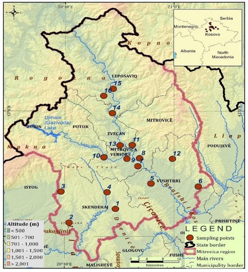 The sampling area was the region of Mitrovica, which is located in the north of Kosovo, and is 2077 km2 in size (Figure 1). The sampling locations were numbered as follows: 1 (Polac), 2 (Vajnik), 3 (Padalishtë), 4 (Klinë e epërme), 5 (Bukosh), 6 (Dumnicë), 7 (Frashër), 8 (Shupkofc), 9 (Mitrovicë), 10 (Kushtovë), 11 (Zveçan), 12 (Karaq), 13 (Zveçan), 14 (Kulla), 15 (Krushevle) and 16 (Leposaviç). The samples of soil and honey were collected from 16 locations spread as homogeneously as possible (Figure 1), and honey bee pollen samples were collected in 9 locations (3, 4, 5, 6, 7, 8, 9, 10 and 11).