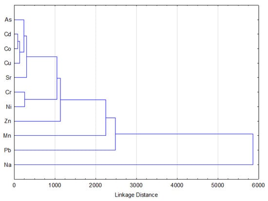 A hierarchical cluster analysis is presented in Figure 2. The dendrogram constructed by Ward’s method revealed six clusters. The first was associated with Ca, the second with Al and Fe, the third with K and Mg, the forth with Na, the fifth with Zn, Mn, Pb, and the sixth with As, Cd, Co, Cu, Sr, Cr and Ni. Clusters of Ca, Al and Fe, and K and Mg, are not presented in Figure 2, as the aforementioned very high values obscured the data. Clusters 1, 2, 3, 5 and 6 were mostly related to the geochemical composition of the soil []. Cluster 5 appeared to be due to the anthropogenic activities, i.e., mainly from the lead smelting sites in Zveçan and Mitrovica (samples 9, 11 and 13). Although elements in cluster 6 may have been of geogenic origin, the concentrations of these elements and the pollution indices indicated that some sites were also polluted with As, Cd, Co, Cr, Ni, and Cu. The increased concentrations of these elements also originated from mineral processing at the aforementioned lead and zinc smelting sites [,].