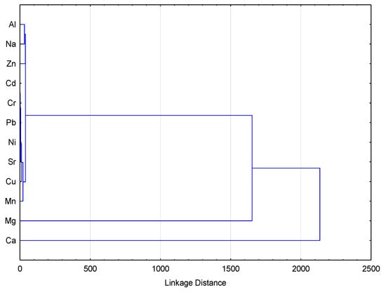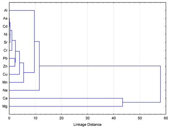 A cluster analysis with Ward’s method revealed three distinct groups of elements in pollen (Figure 4). The first group was made up of K and P (not shown in the cluster), the second comprised Ca and Mg, and the largest group was constituted of Mn, Cu, Sr, Ni, Pb, Cr, Cd, As, Zn, Na, Al. The first and second groups were of natural origin. Group three included elements which are not used during in industrial process in the area of investigation. However, Pb and particularly Zn are indicators of pollution because of mining and ore processing activities, as are elements which are associated with their ores. An important pathway for the pollution of pollen with anthropogenic elements can be atmospheric deposition, since pollen is exposed to open air and elements can be transported as fine dust onto flowers [].