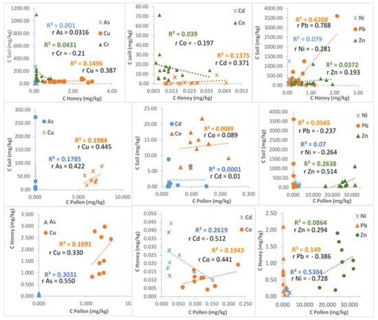 According to the results shown in Figure 5, as expected, the highest values of all the potentially toxic elements were found in soil (vertical axes in the first two rows of the plots). Also, a higher concentration of a given metal in soil is not necessarily reflected in pollen or honey. For example, although Cu concentrations in soil were lower than those of Ni and Pb, in honey, they were higher. Also, if one element is found at higher concentrations in soil, it may be present at lower concentrations in honey. In Figure 5, the Pearson’s coefficients show that there was no correlation for As for soil–honey, Co for soil–pollen, and Cd for soil–pollen. There were 11 weak correlations, six moderate, and only two strong correlations. The strongest correlation was that for Pb between soil and honey, with a value of 0.788, and for Ni in the pair honey–pollen, with a value of 0.728. Soil–pollen and honey–pollen were the pairs with the greatest number of significant correlations. Eight correlations were negative, despite the fact that in all cases, no correlation or positive correlation was to be expected. The weak and negative correlations between concentrations of heavy metals in soil, honey and pollen can be attributed to the complexity of honey and pollen collection by bees. The distribution of heavy metals in soil is quite heterogeneous, and there is a large variety of plants which can absorb different elements in different quantities through their root systems []. Honey, and particularly pollen, are effected very much by dust. Bees forage in places such as dumps, when they can take water or other materials which may be heavily polluted with heavy metals, leading to the contamination of honey and pollen which is otherwise situated in a not heavily polluted area.