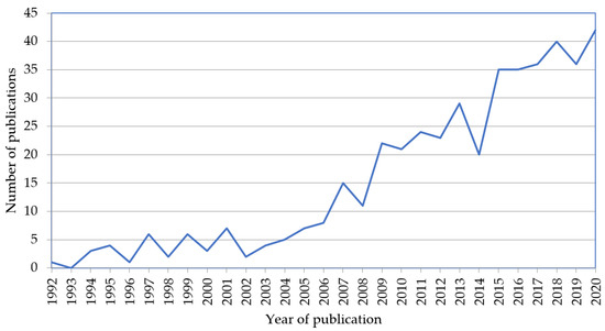 The 448 documents that form the WoS sample for our research were published between 1992 and 2020 (Figure 2). The annual publication rate describes two distinct trends. From 1992 to 2006, scientific production in this field is not very numerous; it is from 2006 onwards, and possibly driven by the 2006 World Health Organisation report [19], that scientific production describes an upward trend that continues to the present day.