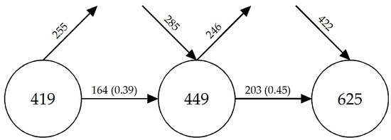 In order to find elements that indicate the state of development of a field of research, the use of keywords and how they have evolved over time in the different periods is analysed, using the method of Price and Gürsey [77] (Figure 3). This methodology represents the periods analysed with circles, in which the keywords that have been used in that period are listed inside them. The circles are linked by an arrow representing the keywords that are used from one period to another, and in brackets, the stability index or overlap fraction. The incoming arrows in each circle represent the keywords that are used for the first time, and the outgoing arrows symbolise the keywords that are no longer used in the following period.