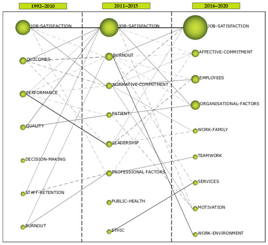 Once it has been established that there is a wide margin of development in the literature relating organisational commitment (OC) and healthcare (HC), the next objective is to analyse, by means of longitudinal maps, the evolution of research work related to these two concepts (Figure 4). The first finding, due to its significant consistency, is the persistence of the Job-satisfaction cluster as the leader of the research trend throughout the three periods analysed. This cluster, with respect to the others, agglutinates a greater number of documents, maintaining a constant growth period after period (72 docs, 1992–2010; 96 docs, 2011–2015; and 134 docs, 2016–2020) (Table 4). However, the behaviour of the impact of publications on the topics to which this cluster is related has been decreasing. Thus, in the first period, the impact was 6194 citations, in the second period, it was 2322 citations, and in the third period, it was only 870 citations. The explanation for these last two periods may lie in the short time span, and the significant impact of the first may be due to the contribution of various literature reviews and meta-analyses such as the work of Humphrey et al. in 2007 [78], “Integrating Motivational, Social, And Contextual Work Design Features: A Meta-analytic Of The Summary And Theoretical Extension Work Design Literature”, with 863 citations; Thoresen et al. in 2003 [79], “The Affective Underpinnings Of Job Perceptions And Attitudes: A Meta-analytic Review And Integration”, 458 citations; Hayes et al. in 2006 [74], “Nurse Turnover: A Literature Review”, 457 citations; Cheng and Chan in 2008 [47], “Who Suffers More From Job Insecurity? A Meta-analytic Review”, with 455 citations; Lu et al. in 2005 [9], “Job Satisfaction Among Nurses: A Literature Review”, with 353 citations, among others.