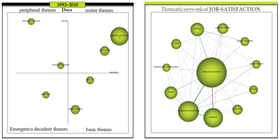 In the case of the first period (1992–2010), in the internal analysis of the Job-satisfaction thematic network, the main driving theme and, as a consequence, the cluster leading the research trend, we found with a density equal to or greater than 0.10 the following dyads (Table 5): (a) Job-satisfaction with the themes Turnover-intention, Nurses, Stress, Work, Empowerment, and Absenteeism, (b) Nurses with Turnover-intention, (c) Stress with Social-support, (d) Turnover-intention with the themes Absenteeism, Work, and Career. The themes that—although important as a trend—did not reach the established limit of 0.10 weight in the density of their relationships within the cluster were Hospitals, Care, and Normative commitment.