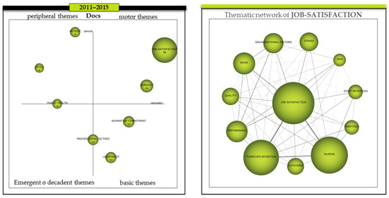 As for the period 2011–2015, Job-satisfaction repeats as the main driving theme with a centrality and density of 144.69 and 43.25 respectively, which is even higher than in the previous period (Table 4). This is joined by Burnout, which evolves from the previous period, when it was considered as a declining or emerging theme (Figure 6-left). Its centrality and density were 53.12 and 16.5, which was much higher than in the previous period. As basic themes, we find Normative-commitment and Leadership, whose centrality and density were 47.56/14.79 and 43.68/9.97, respectively. On the other hand, on the border between the emerging themes and the basic themes is the Professional-factor cluster, with a centrality of 27.07 and a density of 14.65, and, on the border between these and the peripheral themes, the Public-health cluster with a centrality of 9.3 and a density of 15.48. Finally, in the upper left quadrant, the peripheral themes formed in this period are Patient and Ethic with a centrality and density of 9.3/15.48 and 4.65/22.22, respectively.
