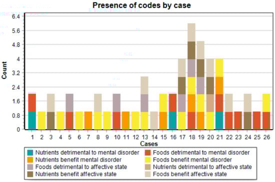 When comparing categories, it is observed that the frequency and presence of the category “Diet and mental disorder” is far beyond the category “Diet and affective state”. The first was coded a total of 64 times and the second a total of 44 times. This superiority holds when comparing each of the codes from the two categories. When compared by subcategories, it is observed that the frequency and presence of information on the beneficial effects of food/nutrients on mental health are always greater than the information on the detrimental effects of food/nutrients. Furthermore, the content on the effects of foods on mental health is more frequent and has a greater presence than the information on the effects that nutrients have.