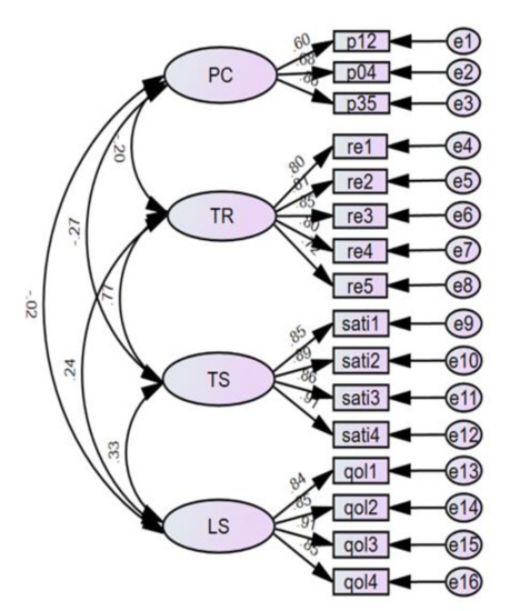 Standardized regression weights of the full measurement model. PC: perceived coercion, TR: therapeutic relationship, TS: therapeutic satisfaction, LS: life satisfaction.