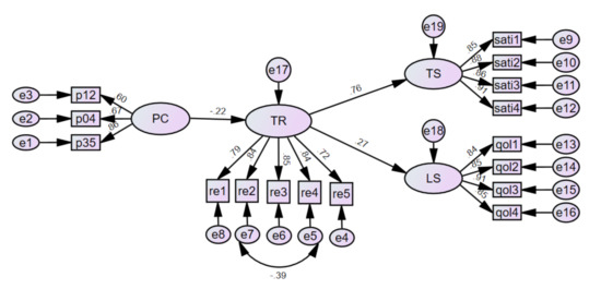 From Table 5, it can be seen that three paths from PC to TR, from TR to TS, and from TR to LS are significant at the 0.05, 0.001, and 0.001 levels, respectively. Therefore, perceived coercion significantly affected therapeutic satisfaction and life satisfaction mediated by the therapeutic relationship. The path regression weight from PC to TR was −0.216, from TR to TS it was 0.762, and from TR to LS it was 0.271. In other words, the lower perceived coercion is, the better the therapeutic relationship is, and this has a positive effect on the therapeutic satisfaction and life satisfaction of persons with mental illness.