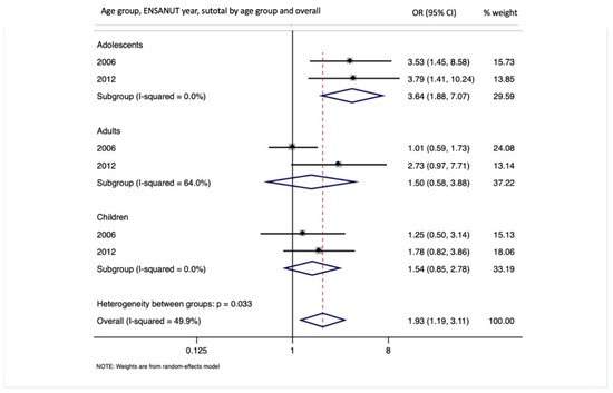Our study analyzed the association between average past-year satellite-derived exposure to PM2.5 and the prevalence of obesity in of children, adolescents, and adults at two time points. This approach is different from other studies that have focused on a single age group or a specific population sample; furthermore, this is the first study with a representative population in one of the largest and most populated cities in Latin America. Overall, we observed an almost twofold increase in the odds of obesity (ORpooled = 1.96 (95% CI: 1.21, 3.18)) for each 10 µg/m3 of PM2.5. However, the association was strongest for adolescents, in line with other studies that have found, that exposure to high levels of traffic density was associated with higher attained BMI over an eight-year follow-up, and that traffic related air pollution had a stronger association compared to traffic density [25,28]. There is also evidence of obesity exacerbating the effects of air pollution on cardiometabolic disease markers [35]. A study in non-diabetic Indonesian adolescents found an association of long-term PM2.5 exposure and an increase in fasting plasma glucose levels [26], adding to the knowledge of possible mechanisms related to the association we observed in this age group. Although the results for children in the 2012 survey were marginally significant, those for 2006 were not. Nevertheless, both showed increased odds of obesity, similar to other cross-sectional studies in China and Spain that have found increased risk of obesity with PM10 and PM2.5, respectively [18,19]. Longitudinal studies in children that have assessed air pollution exposure since early stages (some including prenatal exposures) have mixed findings, with positive [23], null [13,36], and inverse associations [15]. Furthermore, the association for prenatal exposure to PM2.5 and childhood obesity seems to be stronger for those born to obese mothers [31]. Our study was unable to account for earlier life or prenatal PM2.5 exposure, but assuming there was no strong variability of PM2.5 between 2006 and 2012, our results suggest that there might be an increased risk for obesity as the population transitions from childhood to adolescence. Then, in the transition from adolescence to adulthood, unmeasured confounders (such as diet and physical activity) might be driving the apparent reduction in risk we observed.