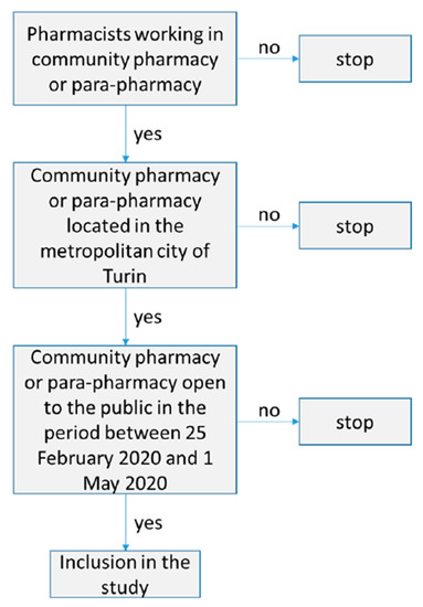 The first case of the COVID-19 epidemic was detected in Italy on 21 February 2020 [9]. As a result, a few days later, on 24 February 2020, pharmacists in Piedmont received the first related health/hygiene recommendations. In particular, pharmacies were included among the points in which it was recommended to make hand sanitizer available for disinfecting hands to all users. Furthermore, pharmacies were recommended to inform their clients of the best practices to adopt in order to prevent the spread of the epidemic and to curb the effects of the many fake news reports in circulation: they were given the support of the specific informational material provided by the Istituto Superiore di Sanità (Higher Health Institute) and the Italian Health Ministry. This material instructed readers to wash their hands frequently, avoid close contact with people suffering from acute respiratory diseases, avoid touching the eyes, nose, and mouth, cover the mouth and nose when coughing or sneezing, avoid taking antibiotics or antiviral drugs unless prescribed by a doctor, disinfect surfaces with a chlorine- or alcohol-based disinfectant. As regards protection equipment for the respiratory tract, the instructions were to use them only when one had the suspicion of having been infected or when assisting infected people.
