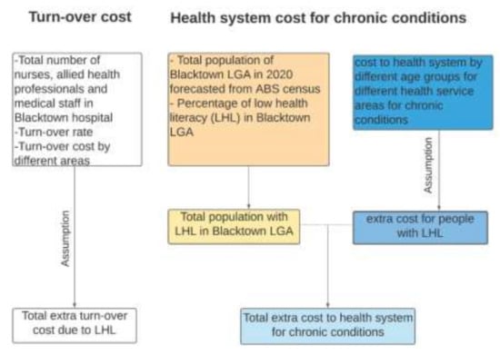 Those delivering health care services face increased stress and professional responsibilities due to the increased demand for health care that LHL levels produce. Research has shown that the turnover rate of health care providers is often high in areas with significant rates of LHL among community members [47]. In this study, we have estimated the extra economic cost of higher rates of staff turnover for nurses, allied health professionals, and other medical staff members (a category that includes staff not classified as nurses, doctors, or other specialists). These staff members comprise about 70% of the total staff in the Western Sydney Local Health District [48]. The total number of nurses, allied health professionals, and other medical staff members at Blacktown Hospital was sourced from a 2015 report by the Western Sydney Local Health District [48]. The population growth rate was applied to this figure in order to estimate the number of staff in 2020. The turnover rate of 10.7% [48] was applied to estimate the full-time staff member turnover in 2020. Our calculations assumed that 10% of this staff turnover was due to LHL. The extra cost of higher rates of staff turnover was calculated by multiplying 10% of the total number of staff turnover with relevant associated costs, such as advertising, hiring, temporary replacement, and training. The figures used to cost the turnover of medical staff were sourced from a 2015 study by Roche et al. that estimated the cost of nurse turnover in Australia and adjusted for inflation [49]. We have assumed that the costs for allied health professionals and other medical staff members are similar to nurses. Our framework for estimating the health care system cost is summarised in Figure 1.