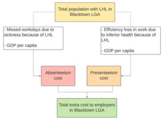We have used the AIHW’s disease expenditure data of 2015–2016—a measurement of the health costs of those who live with chronic conditions—in order to estimate the extra direct costs borne by chronic disease sufferers with LHL. These figures were inflation-adjusted to reflect the 2020-dollar value before the per capita cost was calculated from the expenditure. Following Friedland et al.’s (1998) estimate [46], it was assumed that the extra cost due to LHL is the existing cost, marked-up by 10%. The extra cost was then multiplied by the Blacktown LGA population in order to calculate the total extra cost to different age groups, disease conditions, and service areas. For chronic illness sufferers, the extra cost of LHL was estimated across several areas of medical service, including the services performed by allied health practitioners and general practitioners, the economic strain further prescribed medications place on the pharmaceutical benefits scheme, the additional charges incurred by extra visits to the emergency department of a public hospital, admittance as a patient, and outpatient charges, as well as specialist service providers. Cardiovascular disorders, musculoskeletal disorders, mental illnesses, cancers, chronic kidney diseases, respiratory disorders, and diabetes were the chronic health conditions considered in this study.