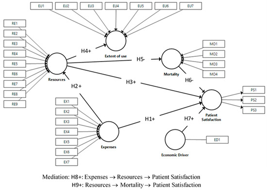 Research model and hypotheses. PS: Patient Satisfaction, EX: Expenses, RE: Resources, EU: Extent of use; MO: Mortality, ED: Economic driver.