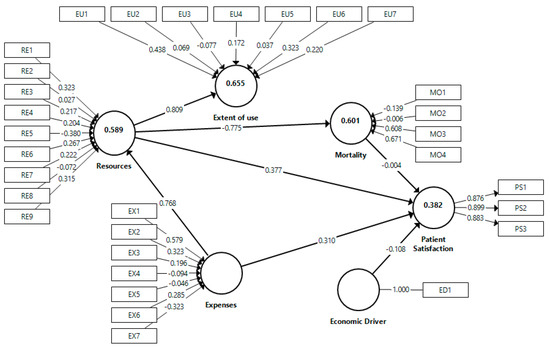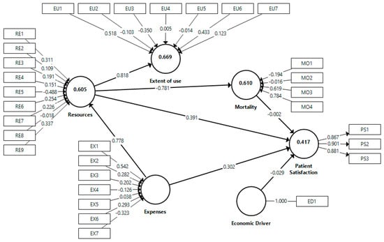 The value and sign of the weights inform us about the contribution of indicators to the construct. Indicators with higher weights have more influence on the construct, and therefore on patient satisfaction. For example, public health expenditure per protected inhabitant (EX1) was the most influential on the expenses construct (0.579). Also remarkable is the negative sign of the indicator representing pharmacy spending (−0.323). We can interpret the rest of the indicators similarly.