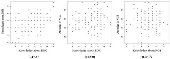 Figure 2 shows the correlations between patients’ knowledge of OC and NGS and their attitudes towards NGS. There is some correlation between patients’ OC knowledge and their NGS knowledge, but there is no correlation between their attitude and knowledge scores.