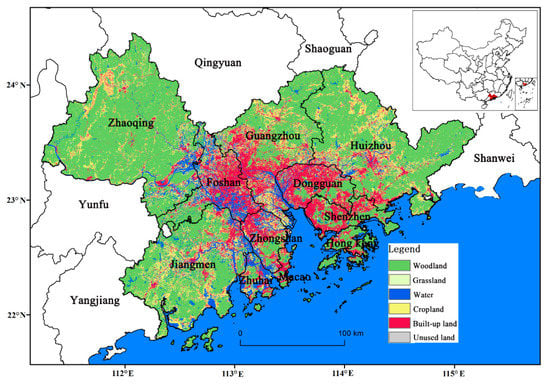 Land use and land cover (LULC) data in 2018, with a spatial resolution of 30 m, was provided by the Resources and Environmental Scientific Data Center (RESDC) of the Chinese Academy of Sciences (CAS) (http://www.resdc.cn/ accessed on 11 June 2019). Population distribution data with a 100 m resolution in 2018 was obtained from WorldPop (https://www.worldpop.org/ accessed on 26 June 2019). Landsat 8 OLI_TIRS satellite remote sensing images were downloaded from the U.S. Geological Survey (http://earthexplorer.usgs.gov/ accessed on 23 August 2019) to map the land surface temperature (LST) in the GBA. Due to severe cloud obstruction in 2018, this study used the most complete and cleanest remote sensing images in the summer daytimes (from June to September) of 2019. The LST data with spatial resolution of 100 m was estimated through a practical split-window algorithm from the Thermal Infrared Sensor (TIRS) onboard Landsat 8 [].