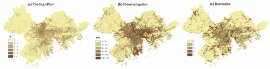 Additionally, some uncertainties of this method need to be considered. (1) Some ecological parameters were taken from empirical studies performed in similar spatial and climatic settings, but nevertheless the parameters should be treated with care. For example, parameter in Equation (3) was proposed to use 0.2 in the GBA; however, some studies used 0.05 instead of 0.2 for urban environments. (2) This study focused on green spaces only for recreation service, which excluded water bodies where many people would spend time for recreation. Some studies showed the importance of green spaces in inner-city areas for recreation as compared to water bodies []. Moreover, the standard of demand for recreation, which has often been proposed by planning and research, was 300 to 1000 m walking distance for pedestrians for green spaces [,]. To calculate the matching of supply and demand of recreation, this study only focused on green spaces for recreation. (3) The cooling service of grasslands was not considered in this study. Because urban green space was usually composed of grasslands, forests, and shrubs, there were few patches of grassland in main urban areas in the GBA with high intensity of heat island, especially the large patches of grass. The grassland is mainly distributed in areas surrounding forests in the suburbs. Additionally, grass is less effective than tree canopy or water bodies for LST cooling [,]. Therefore, no significant cooling effect was found for grasslands in the GBA.