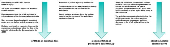 The literature supports our findings concerning how the ambulance professionals are affected by the ePMR in their clinical work practice, i.e., a collaboration between ED and ambulance professionals [2,7,21]. Most of the ambulance professionals reported increased collaboration effort with the ED clinicians following the implementation of the ePMR. This may be explained by the fact that the ED clinicians can gain patient overview in the central ePMR, which they access during handover. This is seemingly because the documented data in the ePMR from the ambulances are used for delegating the patients in the ED and deciding/preparing for further care process in ED. However, the finding of clinical documentation as secondary priority may impede the early decision making regarding care processes in ED, as multiple studies confirm [22,23,24].