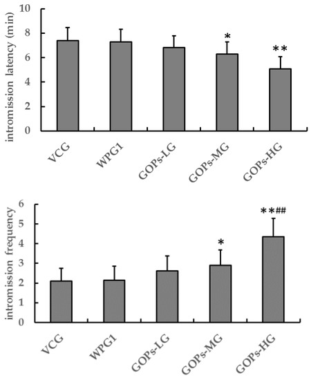 As shown in Figure 1, after 30 days of treatment, there were no significant differences in sexual behavior between VCG and WPG1 (p > 0.05). Compared with VCG, the mice in GOPs-MG and GOPs-HG showed shorter intromission latency (p < 0.05, p < 0.01) and higher intromission frequency (p < 0.05, p < 0.01). Compared with WPG1, the mice in GOPs-HG showed shorter intromission latency (p < 0.01) and higher intromission frequency (p < 0.01).