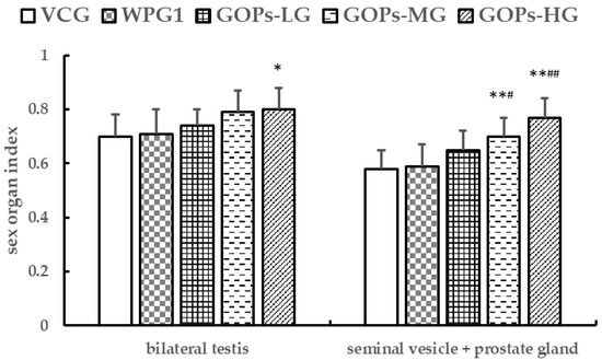 Effects of GOPs on sex organ indexes in male mice. Data are presented as means ± SD (n = 10). * p < 0.05, ** p < 0.01 versus VCG; # p < 0.05, ## p < 0.01 versus WPG1. VCG, vehicle control group; WPG1, whey protein 125.0 mg kg−1; GOPs-LG, 62.5 mg kg−1; GOPs-MG, 125.0 mg kg−1; GOPs-HG, 250.0 mg kg−1.