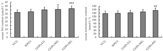 Effects of GOPs on serum NO and testosterone contents in male mice. Data are presented as means ± SD (n = 10). * p < 0.05, ** p < 0.01 versus VCG; # p < 0.05 versus WPG1. VCG, vehicle control group; WPG1, whey protein 125.0 mg kg−1; GOPs-LG, 62.5 mg kg−1; GOPs-MG, 125.0 mg kg−1; GOPs-HG, 250.0 mg kg−1.