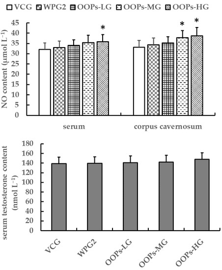 Effects of OOPs on NO and testosterone contents in male mice. Data are presented as means ± SD (n = 10). * p < 0.05 versus VCG. VCG, vehicle control group; WPG2, whey protein 160.0 mg kg−1; OOPs-LG, 80.0 mg kg−1; OOPs-MG, 160.0 mg kg−1; OOPs-HG, 320.0 mg kg−1.
