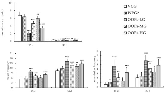 We observed the sexual behavior in male mice treated with OOP for 15 and 30 days. After 15 days of treatment, the sexual behavior was not significantly different among all the groups (p > 0.05, Figure 4). After 30 days of treatment, the sexual behavior parameters were not significantly different between VCG and WPG2 (p > 0.05). Interestingly, the mount latency reduced as the dose of OOPs increased, and it decreased significantly in three OOP groups in comparison with VCG (p < 0.01) and showed significant differences in OOPs-MG and OOPs-HG in comparison with WPG2 (p < 0.01). The mice in OOPs-HG had higher mount frequency than those in VCG and WPG2 (p < 0.01, p < 0.05). The intromission frequency increased as the dose of OOPs rose but showed no significant differences among the groups (p > 0.05).