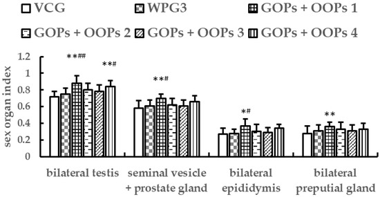 As shown in Figure 8, there were no significant changes in sex organ indexes of mice in WPG3 compared with VCG after 30 days of treatment (p > 0.05). All the sex organ indexes in GOPs + OOPs 1 increased significantly in comparison with VCG (p < 0.01, p < 0.01, p < 0.05, p < 0.01), meanwhile, all the sex organ indexes except bilateral preputial gland index increased significantly in comparison with WPG3 (p < 0.01, p < 0.05, p < 0.05). The bilateral testes index in GOPs + OOPs 4 was higher than that in VCG and WPG3 (p < 0.01, p < 0.05).
