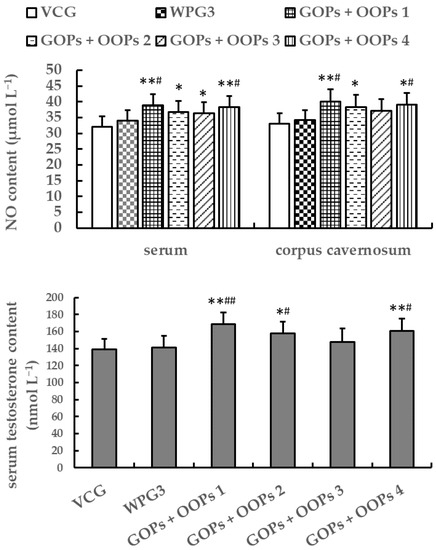 After 30 days of treatment, the testosterone and NO contents showed no significant differences between VCG and WPG3 (p > 0.05, Figure 9). The serum testosterone content of mice in GOPs + OOPs 1, GOPs + OOPs 2, and GOPs + OOPs 4 was higher than that in VCG and WPG3 (p < 0.05). The serum and corpus cavernosum NO contents of mice in GOPs + OOPs 1 and GOPs + OOPs 4 were higher than those in VCG and WPG3 (p < 0.05). The NO content in GOPs + OOPs 2 and GOPs + OOPs 3 increased in serum in comparison with VCG (p < 0.05), and increased corpus cavernosum NO content was found in GOPs + OOPs 3 when compared to VCG (p < 0.05).