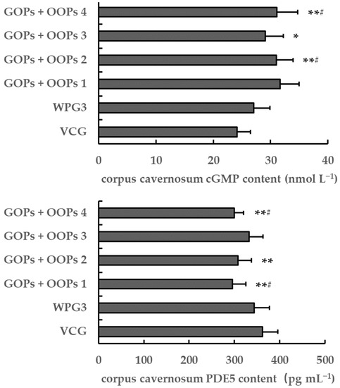 No significant differences were found in the corpus cavernosum cGMP and PDE5 content between VCG and WPG3 after 30 days of treatment (p > 0.05, Figure 10). However, the corpus cavernosum cGMP content in GOPs + OOPs 1, GOPs + OOPs 2, and GOPs + OOPs 4 was higher than that in VCG and WPG3 (p < 0.01, p < 0.05), and increased corpus cavernosum cGMP content was found in GOPs + OOPs 3 in comparison with VCG (p < 0.05). Additionally, the corpus cavernosum PDE5 content in GOPs + OOPs 1 and GOPs + OOPs 4 was significantly lower than that in VCG and WPG3 (p < 0.01, p < 0.05), and it was decreased significantly in GOPs + OOPs 2 compared with VCG (p < 0.05).