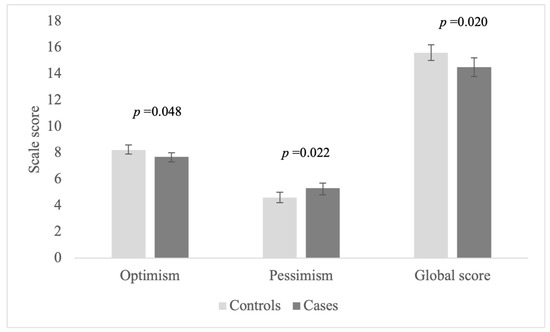 Raw and adjusted LOT-R scores for women with PCOS and controls are shown in Table 2 and Figure 1. LOT-R optimism mean score was significantly higher in controls (8.3 vs. 7.7 points; p = 0.03) compared to cases. On the other hand, cases obtained higher LOT-R pessimism score than controls (5.6 vs. 4.3; p < 0.01), even after the adjustment (p = 0.022). Finally, controls obtained an LOT-R global score of 1.8 points higher than PCOS women (p < 0.01) and this relationship persisted after adjustment (p = 0.020), which indicates significantly higher levels of optimism in controls. The effect size of this difference was relatively high (d = 0.50).