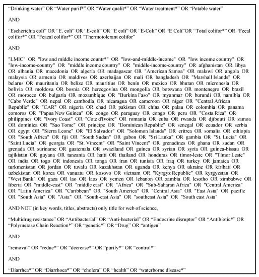 The databases Ovid Medline (PubMed), Scopus, and Web of Science were searched using a set of search terms related to three themes: low- and middle-income countries (LMICs), FIB, and drinking water, excluding pharmaceutical and agricultural terms (Figure 1). Individualized search strings were developed for each database using appropriate field tags and Boolean operators. We finalized the search in July 2020 to include papers published up to this date.