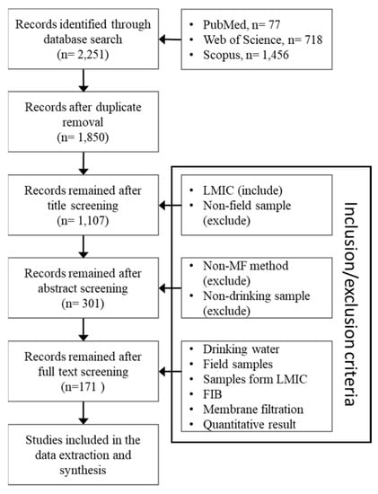 Search results were merged, and the duplicates were removed using EndNote X8.1 (Philadelphia, PA, USA). Unique articles were then screened by title, abstract, and full text using exclusion criteria in Microsoft Excel for Office 365 (Redmond, WA, USA). At title screening, manuscripts not in LMICs or not with source and household water samples were excluded. At abstract screening, in addition to those from title screening, non-membrane filtration FIB testing methods and non-drinking water samples were excluded. In full-text screening, only manuscripts that reported quantitative results from membrane filtration FIB testing of source or household drinking water samples in LMICs were included.