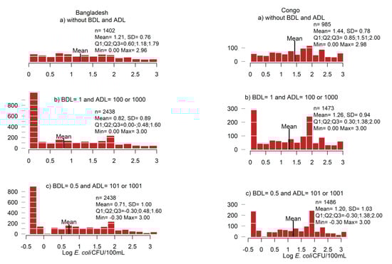 To document any impact on results of different BDL and ADL replacement methods, household Escherichia coli (E. coli) CFU/100 mL datasets from Bangladesh and Congo were analyzed. According to recommendations from Standard Methods [] and what was reported in the systematic review, we prepared data using three methods: (a) removed censored data; (b) replaced BDL and ADL with the detection limit; (c) replaced BDL with 0.5 and ADL with adding 1 to the detection limit. Histograms of log-transformed data are presented in Figure 3.