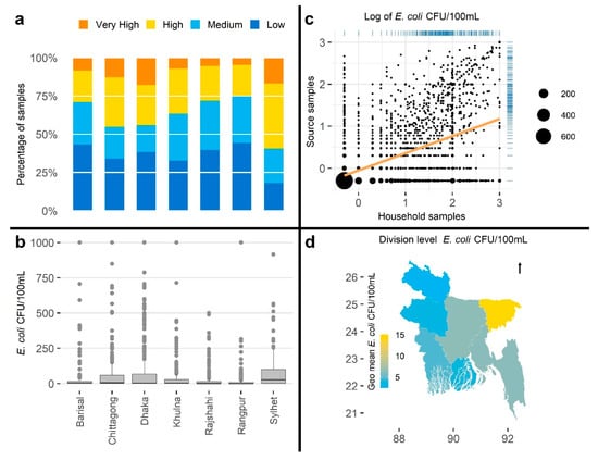 Examples of different visualization for Bangladesh data: (a) bar plot of World Health Organization (WHO) risk categories in household water samples by administrative units, (b) box plot of E. coli colony-forming units (CFU)/100 mL in household water samples by administrative units, (c) scatter plot of log-transformed E. coli CFU/100 mL in household and corresponding source water samples, and (d) map of geometric mean of E. coli CFU/100 mL in household water samples by administrative units.