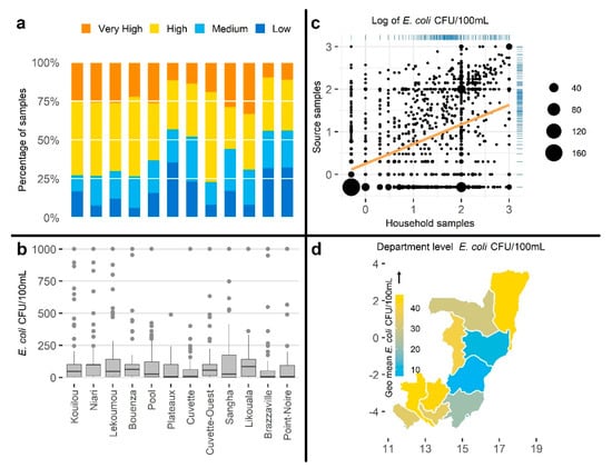 Examples of different visualization for Congo data: (a) bar plot of WHO risk categories in household water samples by administrative units, (b) box plot of E. coli CFU/100 mL in household water samples by administrative units, (c) scatter plot of log-transformed E. coli CFU/100 mL in household and corresponding source water samples, and (d) map of geometric mean of E. coli CFU/100 mL in household water samples by administrative units.