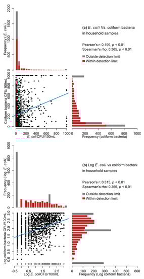 It is commonly assumed that total coliform and E. coli are correlated []. As can be seen (Figure 6), the right-skewed histograms of both variables suggested that the data are non-normal. Pearson correlation between the two variables yielded a weak association (r = 0.199, p-value < 0.001), while Spearman correlation showed a moderate association (ρ = 0.365, p-value < 0.001) (Figure 6) from the Bangladesh data. In the Congo data, Pearson correlation suggested moderate association (r = 0.382, p-value <0.001), while Spearman correlation showed stronger association (ρ = 0.559, p-value <0.001) between the two variables. In this case, Pearson correlation is likely to underestimate the true associations picked up by the Spearman correlation coefficient, because Spearman correlation uses ranked (i.e., relative position label as first, second, third, etc.) values, unlike the Pearson correlation coefficient that utilizes the actual FIB values. Thus, correct magnitude of association may not be observed if the method to detect association is applied without considering FIB data properties, especially as the FIB data are generally not normally distributed.