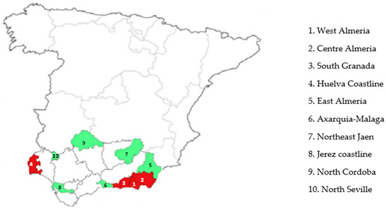 - Consejería de Agricultura, Pesca y Desarrollo Rural, Junta de Andalucía. Cartografía de Invernaderos en Almería, Granada y Málaga; Año. 2017. Available online: https://www.juntadeandalucia.es/export/drupaljda/Cartografia%20_inv_AL_GR_MA_SEE.pdf (accessed on 28 December 2020).