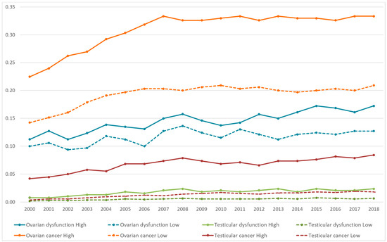 | Gonadal Alterations (n = 5332) | High Exposure | Low Exposure | OR (95% CI) | p Value * |